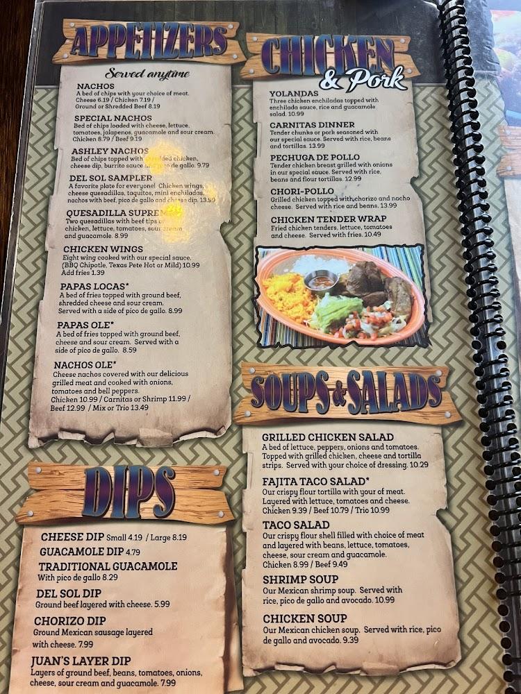 Del Sol's menu caters to a variety of tastes, featuring Mexican classics and creative twists. Diners can choose from numerous options, including tacos, burritos, and seafood. The vegetarian offerings ensure that everyone can indulge in a delicious meal. Unique appetizers, like Juan's Layer Dip, set a delightful tone for the dining experience.